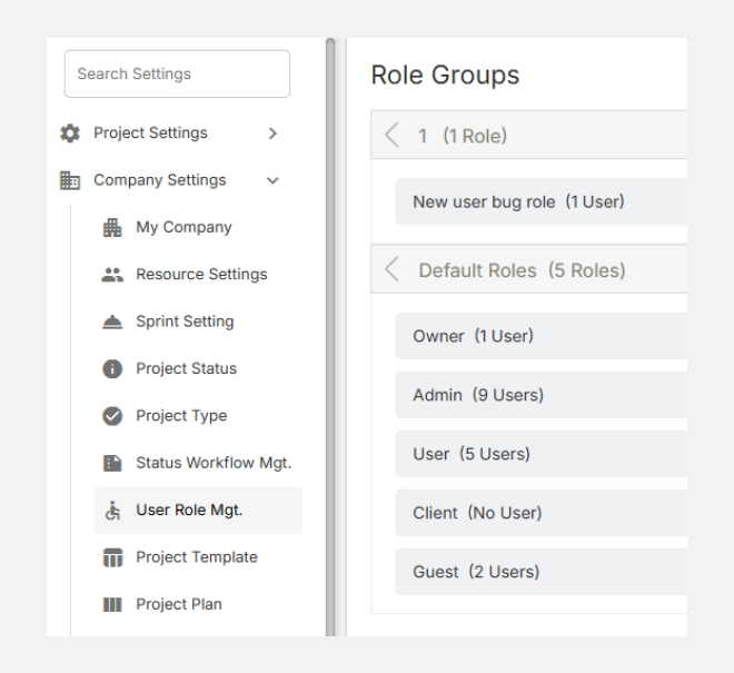 - Navigate to Settings → Company Settings → User Role Mgt.